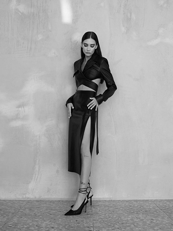 Карина Истомина в кожаном костюме Parit производства Futureal