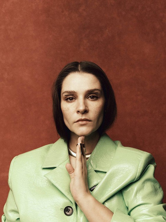 Актриса Глафира Тарханова для Hello! в жакете Rogov производства Futureal