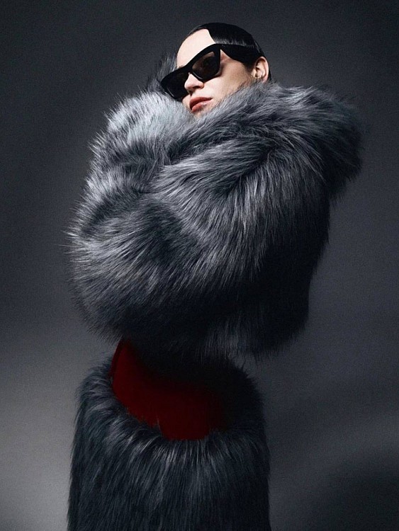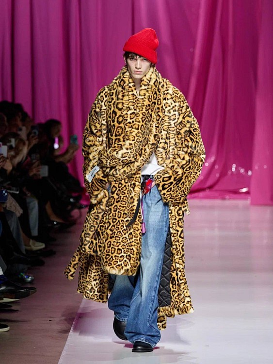 Показ Rogov на Московской недели моды 2024. Шуба из экомеха производства Futureal